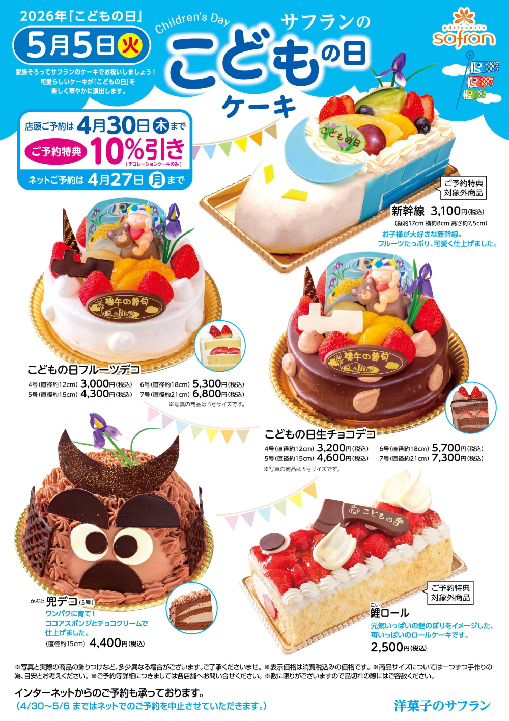 店舗でお受取りいただける子どもの日ケーキのご予約を承ります。